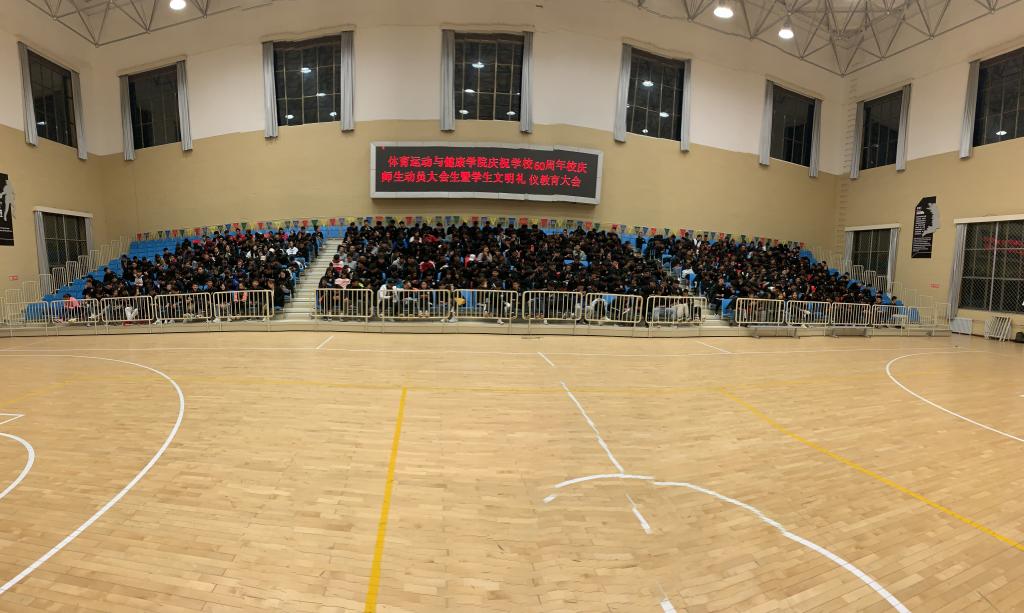 10月8日晚上7:30,今年会jinnianhui在综合体育馆组织召开庆祝学校60周年校庆师生动员大会暨学生文明礼仪教育大会。体育学院领导班子成员、全体教职工及17级、18级、19级全体学生,共计600多人参加。会议由学院党总支副书记吴建全主持。