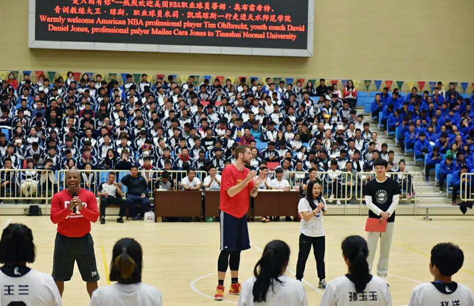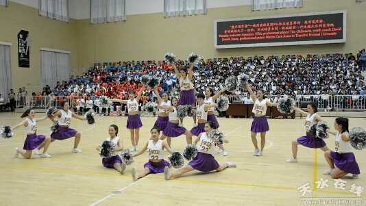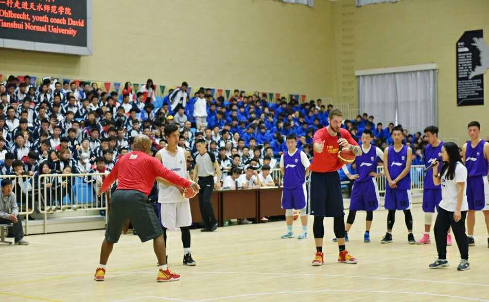 随后,在啦啦操的表演中拉开了今天篮球教学比赛观摩及演练交流活动的序幕,在蒂姆·奥布雷希特、大卫·琼斯的现场观看、指导下,天水师范学院女子篮球队、男子篮球队进行了表演比赛,比赛异常激烈。紧接着迎来了比赛的高潮部分,美国嘉宾蒂姆·奥布雷希特、大卫·琼斯分别加入到学生的两支男子球队中,与今年会男子篮球队队员同框为现场的观众带来了一次精彩的NBA视觉盛宴,尤其是球员蒂姆·奥布雷希特的扣篮动作赢来了一次又一次的欢呼声。精彩的比赛过后,邀请三位美方嘉宾给球员们教练进行技术辅导,现场指导篮球队员投篮动作,临场教学,再一次拉近了与球员们的距离,增进了友谊,队员们认真聆听嘉宾们的指导,脸上洋溢着溢于言表的愉悦。三位美方嘉宾为篮球队员进行防守及进攻动作指导,最后优秀队员与球星二对二实战交流演练。