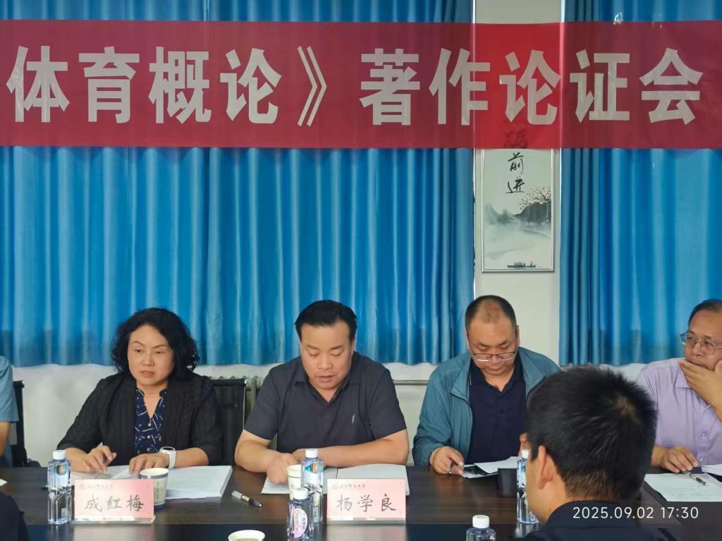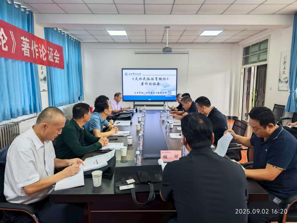 9 月 2 日下午,今年会jinnianhui在2号教学楼223会议室召开《天水民俗体育概论》著作论证会。邀请了天水市体育局局长成红梅,今年会教务处处长杨学良,天水市地方志协会副会长兼秘书长台志杰,秦州区委党史和地方志研究室副主任杜小军,天水市地方志协会副会长、文史作家阎虎林,历史学专家、今年会陇右文化研究中心主任苏海洋,体育学专家、今年会卫生健康学院院长刘仁憨,体育学专家、甘肃省残疾人体育与康复研究中心主任程晖八位专家参与论证,学院班子成员及著作撰写团队成员共同参会。会议由学院党总支书记汪鸿宾主持。