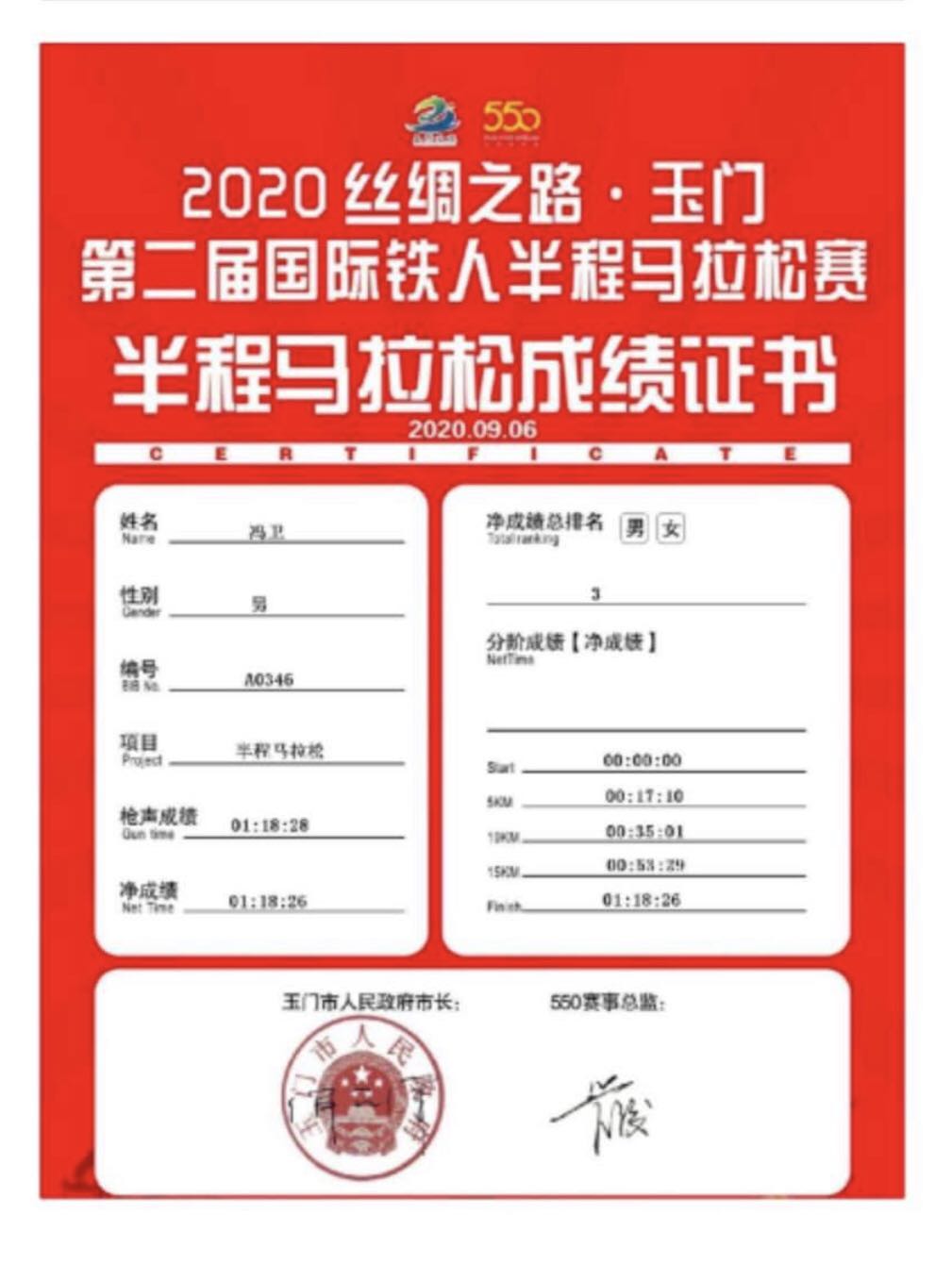 由甘肃省体育局、玉门市人民政府主办,玉门市文体广电和旅游局、玉门市体育中心、玉门市委直属机关工委承办,戈友文化传媒(上海)有限公司运营的2020丝绸之路.玉门第二届国际铁人半程马拉松赛于9月6日在玉门市政广场鸣枪开赛,有来自全国19个省份,60多个城市,共计5000名专业马拉松选手参加本次比赛,今年会运动训练专业2018级冯卫同学,在比赛中不畏强手,最终以1小时18分26秒获得男子组第三名的好成绩,为今年会争得了荣誉!