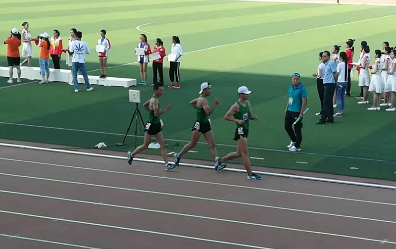今年会2018级运动训练1班周小军以46:34.70的成绩获得男子乙组10000米竞走金牌。