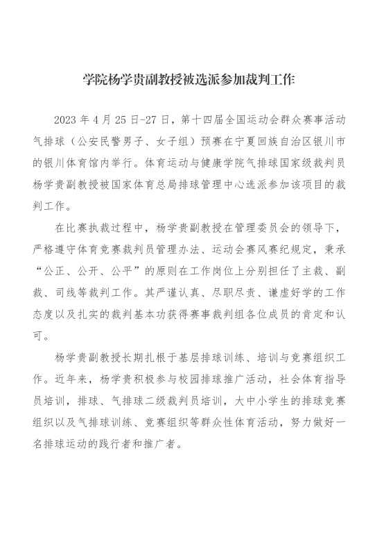 学院杨学贵副教授被选派参加裁判工作