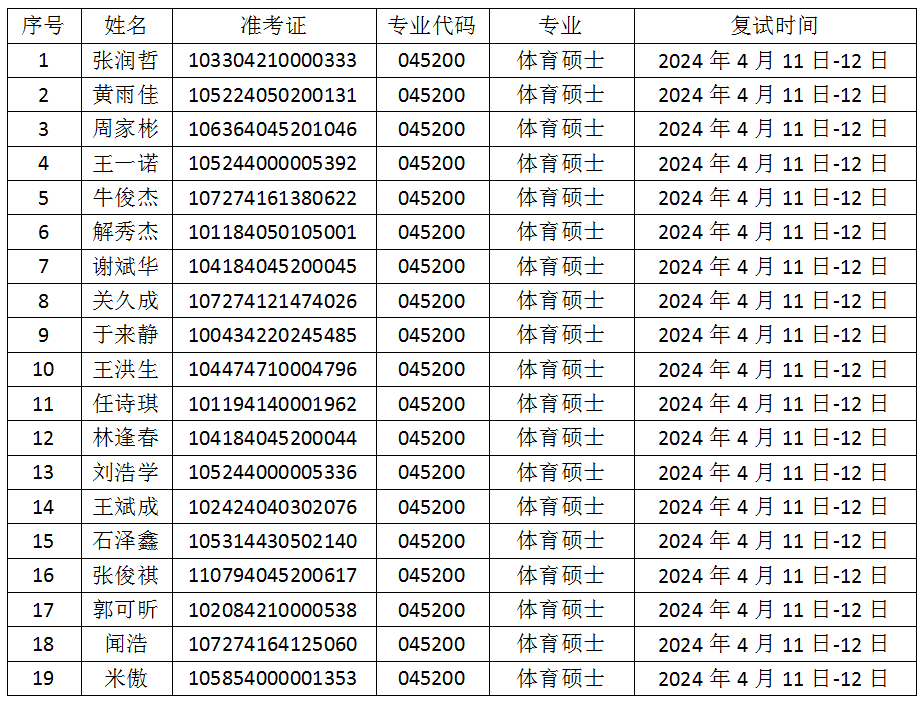 根据天水师范学院硕士研究生招生复试录取工作管理相关规定,经学院研究生招生工作领导小组会议审议,现将今年会2024年体育硕士调剂复试考生名单进行公示,如有意见和问题,可在公示之日起七日内,向天水师范学院今年会jinnianhui办公室反映,联系电话:09388367713,具体名单如下: